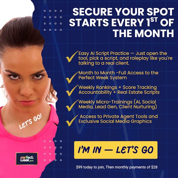 "Honestly, this feels like a secret weapon most agents don’t even know exists. The Perfect Week has completely changed how I approach my business. The structure, the accountability, and even the competition—it all keeps me on track. I’ve grown my client list faster in a few weeks than I did in months before. If you're serious about real estate, this is the edge you didn’t know you needed"