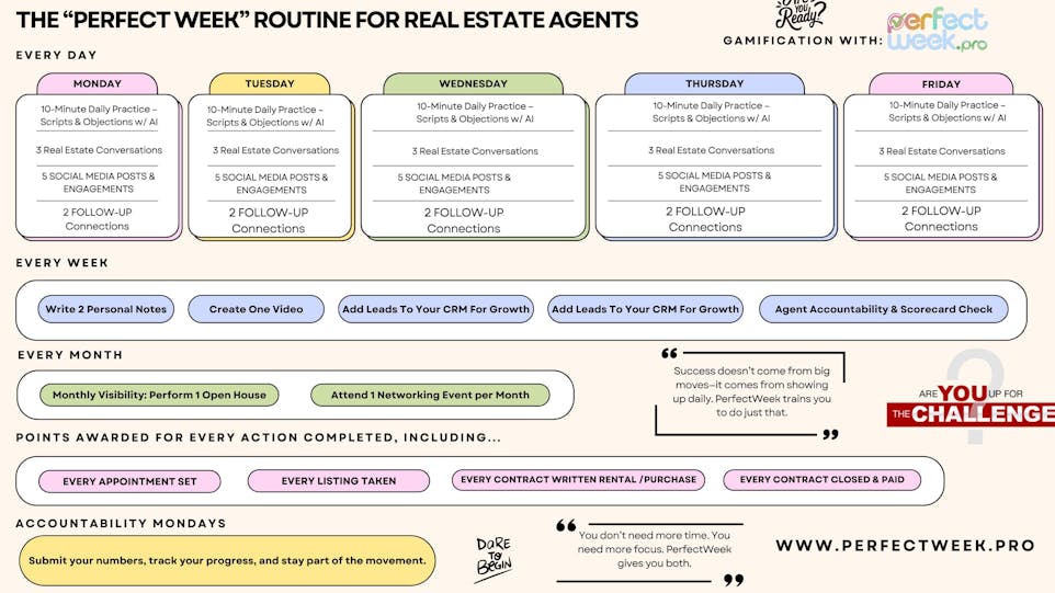 You’ll complete 10 proven actions each week, submit your numbers, and get ranked alongside fellow agents. See how Perfect Week works —